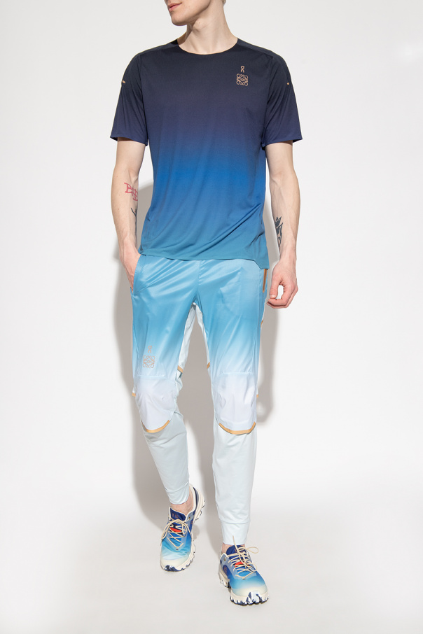 Blue and navy blue ‘Cloudventure’ running shoes from Loewe x ON. Crafted from waterproof material, this lace-up model sits on a multicoloured rubber sole and showcases a brown graphic pattern and gradient effect. A limited-edition capsule collection of shoes and apparel designed for modern adventure. Crafted for city life the great outdoors, it represents a reimagined approach to craft skills.