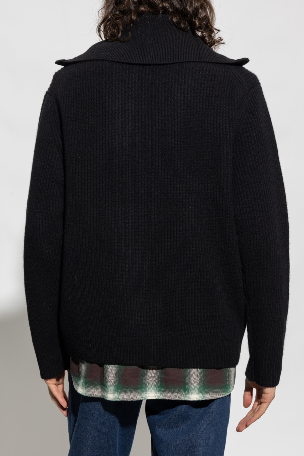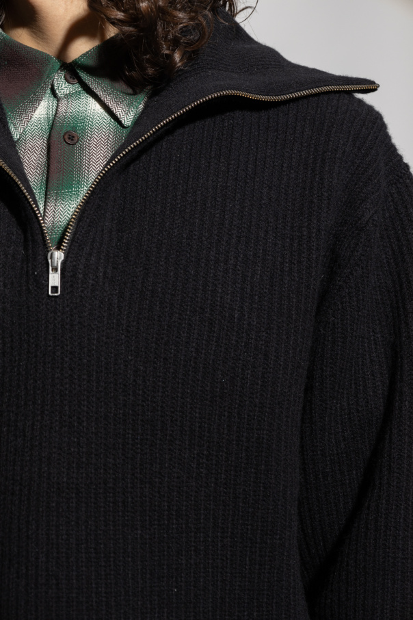 Black ‘Logan’ sweater from Samsoe Samsoe. Crafted from wool with a ribbed knit, this style features a regular fit, a collar with a zip closure, long sleeves and elasticized trims on the edges.