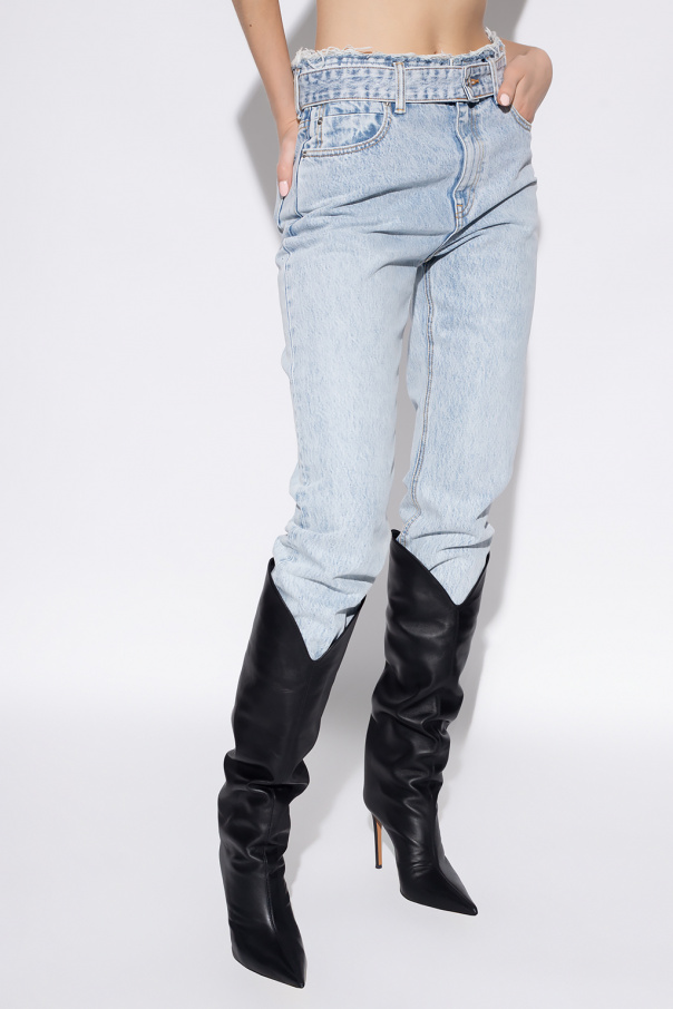 Light blue jeans from Alexander Wang. Made of cotton, this pair falls with straight legs and features a zip fly with snaps, a buttoned belt at the waist, classic five pockets and a black logo patch at the back.