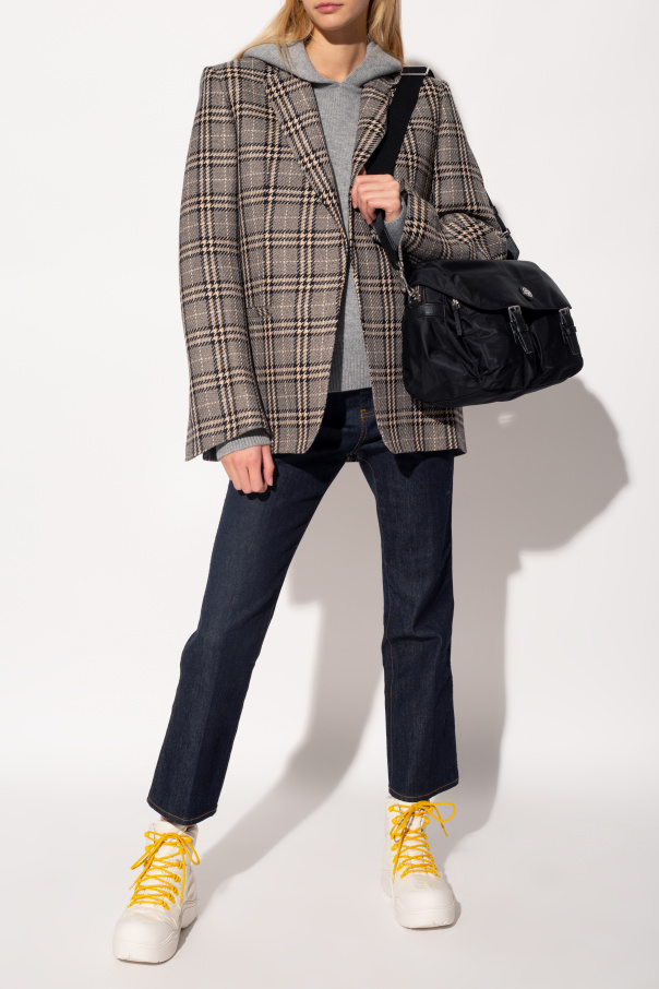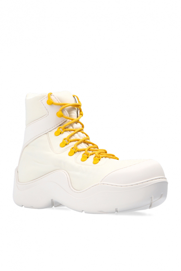 Cream ‘Puddle Bomber’ ankle boots from Bottega Veneta. Resting on a white rubber sole, this lace-up pair features rubber trims and yellow laces.