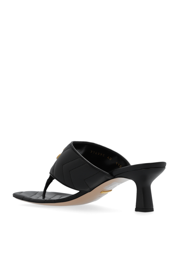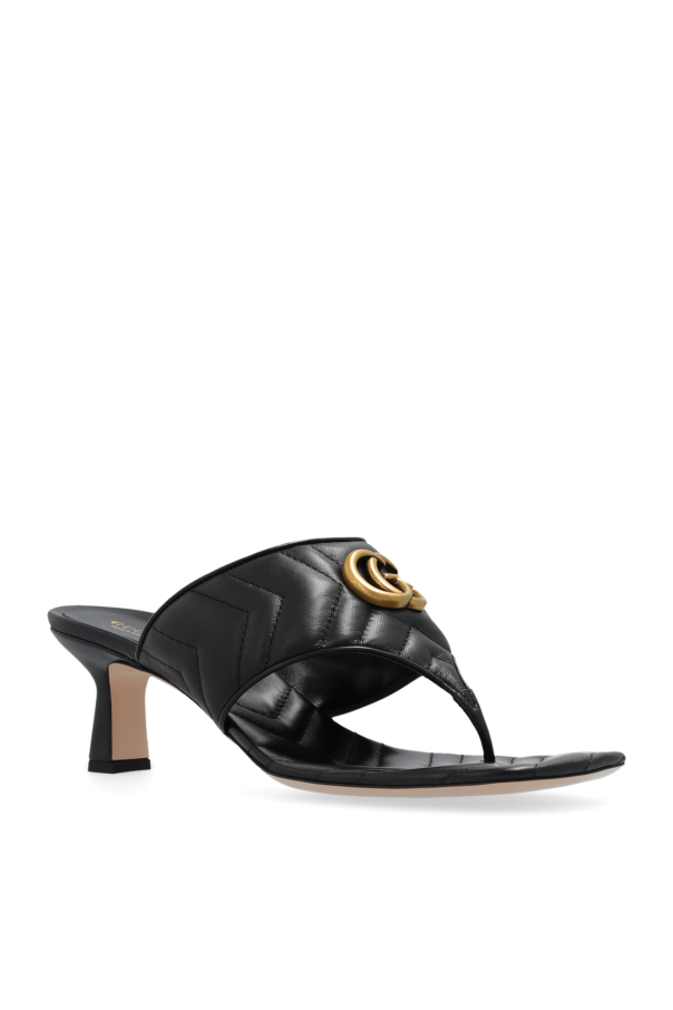 Black quilted thong sandals from Gucci. Made of leather, this pair features a Double G logo in antique gold-tone, a square toe and a beige leather sole.