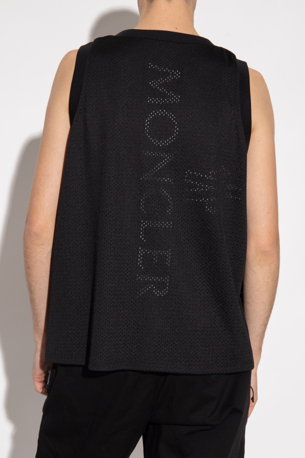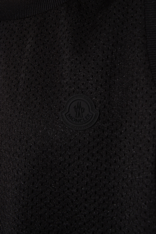 Black sleeveless T-shirt from Moncler. Embellished with a rubber logo patch on the front and a white logo print at the back, this style features a round neck, perforated accents and elastic edges.