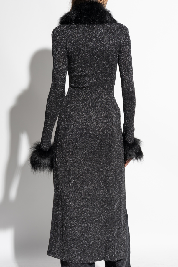 Introducing the Kardigan z logo from the illustrious designer MISBHV, a paragon of opulence and contemporary style. This long cardigan, gracefully extending past the knees, features long, form-fitting sleeves that embody sophistication. Crafted from a dark, lustrous fabric with a subtle, shimmering effect, this garment exudes elegance. The black, glossy material is complemented by luxurious fur detailing on the collar and cuffs, enhancing its refined appearance. The cardigan boasts distinctive features such as two industrial, modern metal clasps positioned at the chest, providing a sleek closure. The deep front cutout boldly reveals the central part of the torso, infusing the design with a daring, avant-garde flair. In keeping with its minimalist elegance, the back of the cardigan remains unadorned, reinforcing its sophisticated and understated aesthetic. The dominant black color, interspersed with subtle silver accents, makes this piece a versatile addition to any high-fashion wardrobe. Why Choose This Product? Designed by the renowned MISBHV, known for blending bold designs with unconventional forms. Luxurious fur detailing on the collar and cuffs for a premium look. Industrial metal clasps add a modern touch. Deep front cutout for a bold, contemporary style. Crafted from a high-quality blend of viscose, polyamide, and other materials for a luxurious feel.