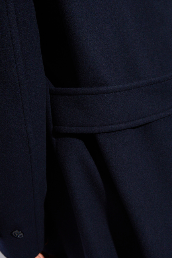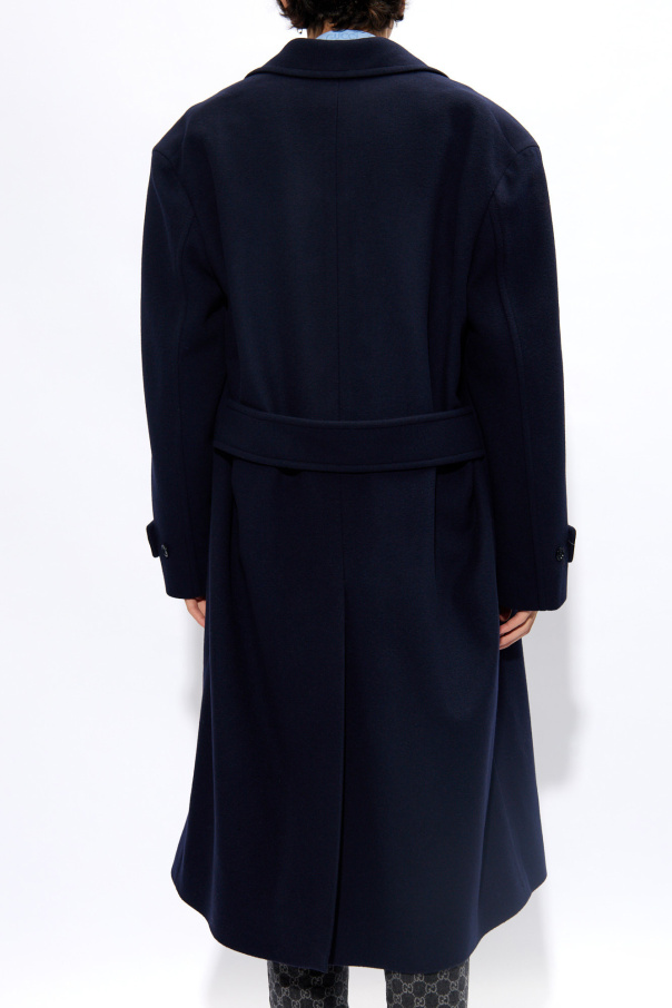 Navy double-breasted coat from Gucci. Made of wool, this design features buttons, two slip pockets, peak lapels, long sleeves and a single rear vent.