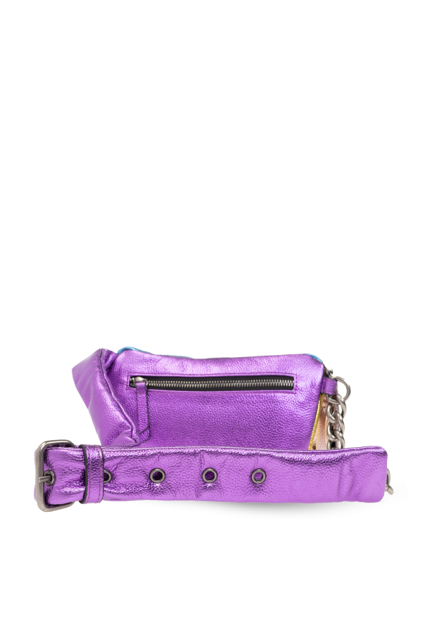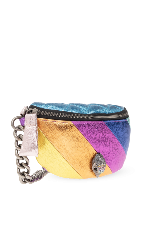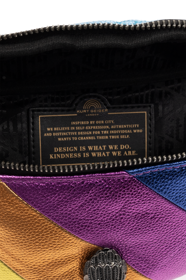 Multicolored ‘Kensington Small’ belt bag from Kurt Geiger. Crafted from leather with metallic finish, this model features two-way zip, stripe pattern, the brand’s signature eagle head embellished with crystals, zipped pocket and logo detail at the back, adjustable strap, one internal compartment and silver-tone metal hardware.
