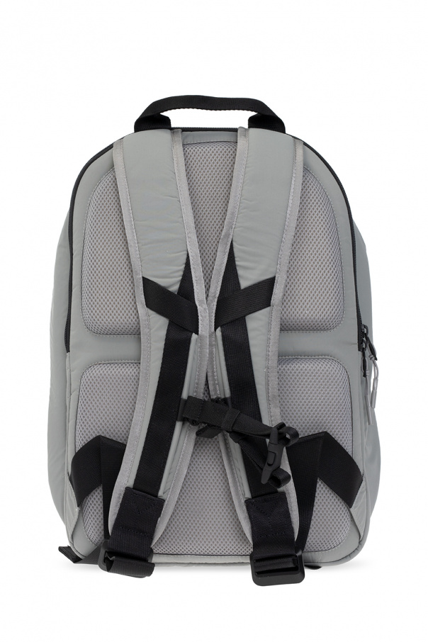 Grey backpack from Y-3 Yohji Yamamoto. Emblazoned with a white and black logo patch, this design features a two-way zip fastening, a zip pocket on the front, a half-round handle, adjustable shoulder straps, black metal hardware and an interior with two compartments.