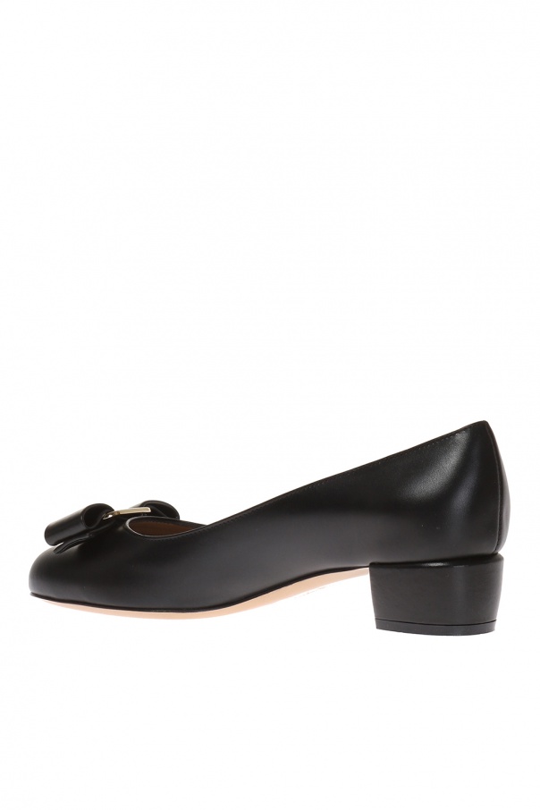 Black 'Vara' pumps from Salvatore Ferragamo. Made of calf leather. Grosgrain bow with gold-tone logo-embossed metal insert on the front. Beige leather sole.