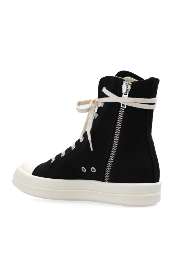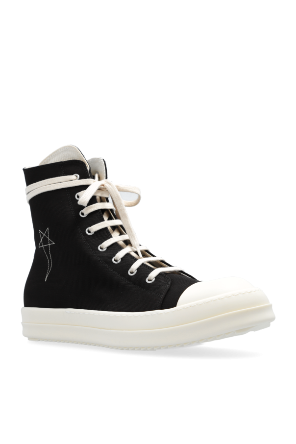 Black ‘Lido’ high-top sneakers from Rick Owens DRKSHDW. Made of ribbed fabric, this lace-up pair features an embroidered logo pattern and a white rubber sole.