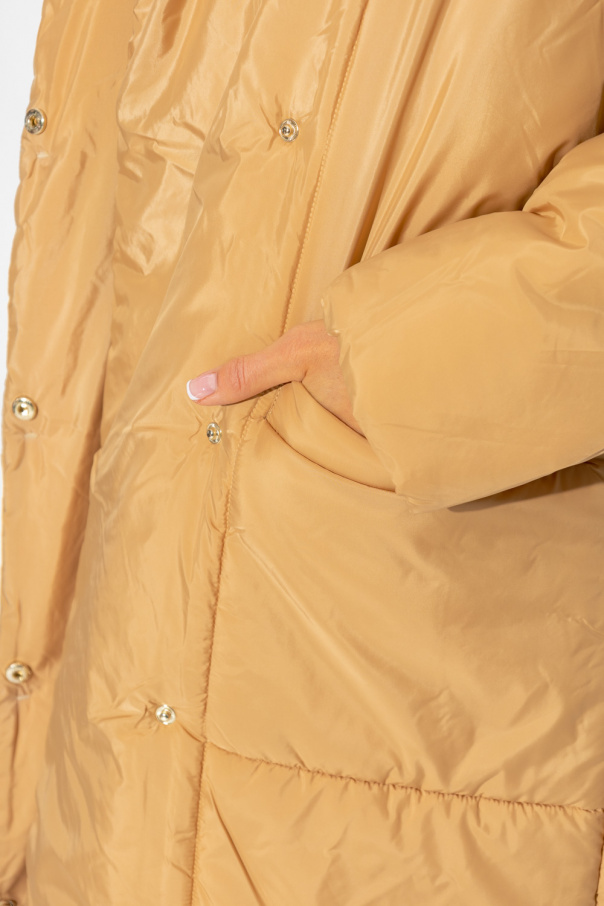 Beige ‘Emilia’ insulated coat from Notes Du Nord. Crafted from 100% recycled material, this style features a long fit with quilting, snap fastenings, two slip pockets accentuated with soft fleece, long sleeves with elasticated cuffs and a white patch with a black logo at the back.