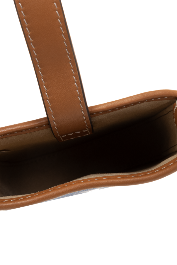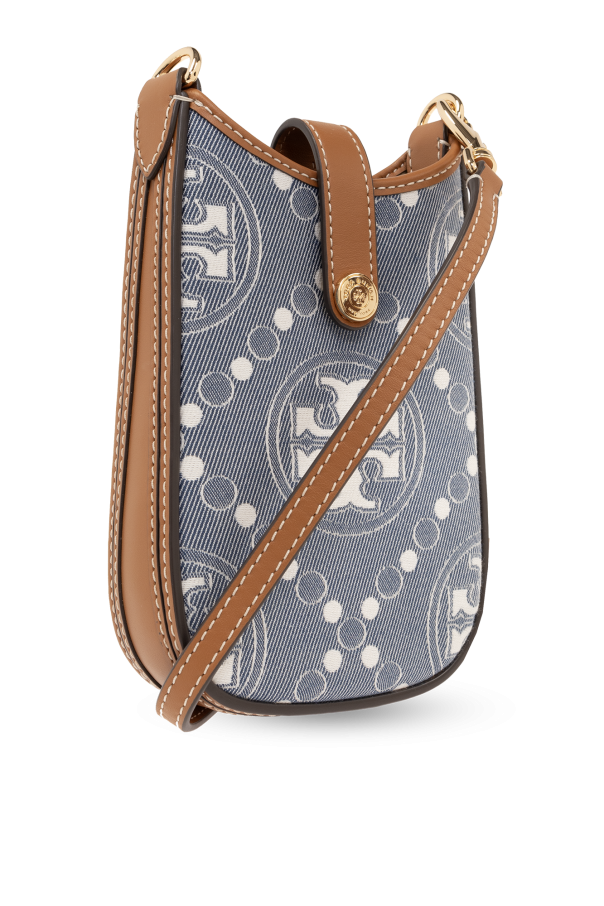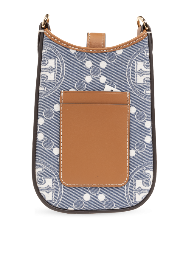Blue, white and brown ‘T Monogram’ phone pouch from Tory Burch. Made of denim embroidered with a monogram embroidery and leather trims, this model features a snap closure, two card slots at the back, detachable and adjustable strap, one internal compartment and gold-tone metal hardware