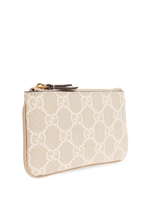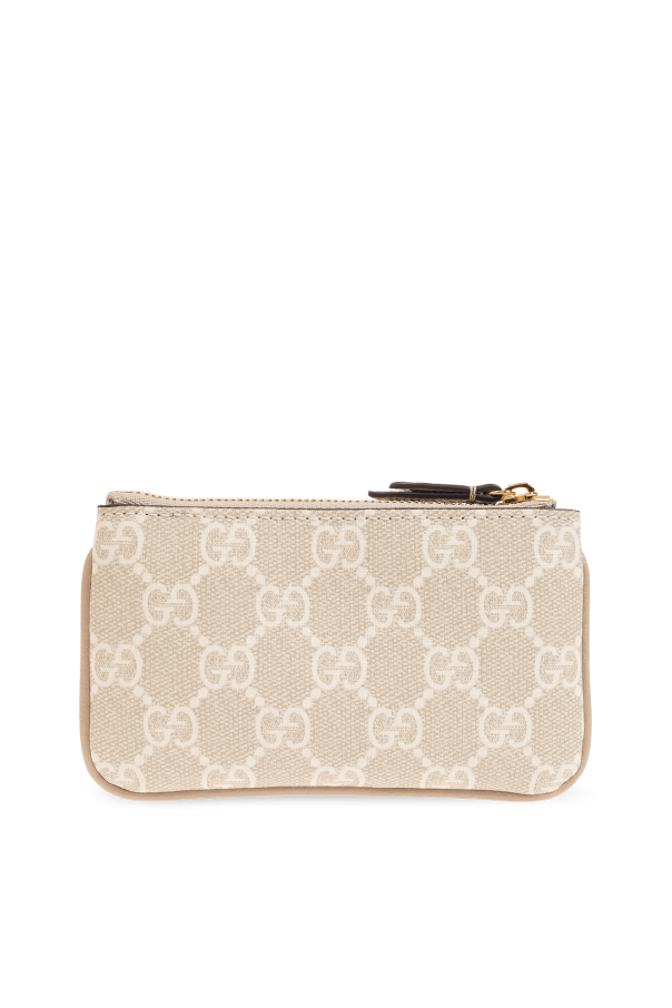 Beige and cream key case from Gucci. Made of ‘GG Supreme’ canvas, this item fastens via a zip and features one internal compartment with a lobster clasp on a chain.