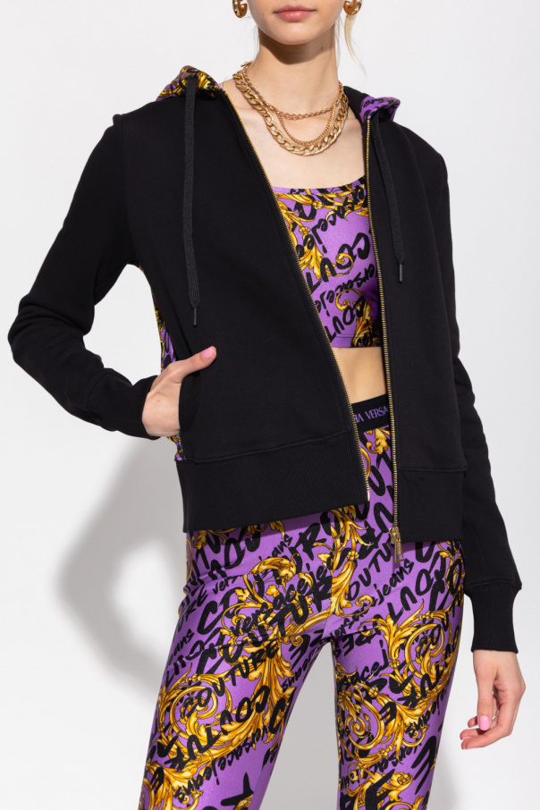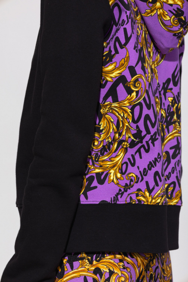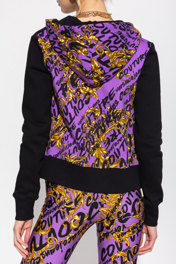 Black hoodie from Versace Jeans Couture. Crafted from cotton, this garment features a zip fastening, purple, brown and yellow pattern, drawstring hood and ribbed trims at the hem and cuffs.