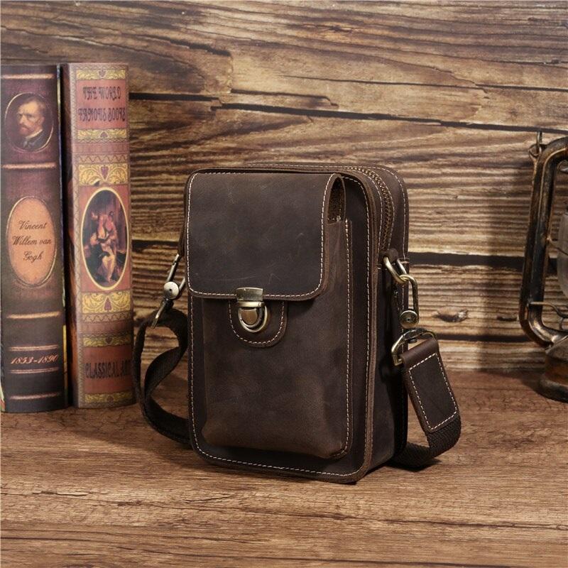 Небольшая мужская сумка, изготовленная из кожи. Позволяет освободить карманы одежды и хранить все самые важные вещи, а именно: телефон, кошелек, ключи, блокнот, наушники. Для выполнения своей функции имеется основной отсек и один вспомогательный карман, закрывающихся на металлический замок. Для ношения сумки предусмотрен регулируемый наплечный ремень, и хлястик для ношения на поясе (Ремне).Фурнитура (все замки) металлическая.Бренд MUZI