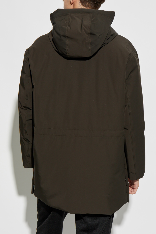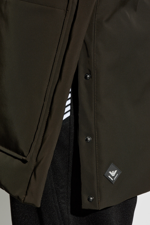 Introducing the Emporio Armani Down Jacket, an exclusive piece from the men's collection, epitomizing elegance and functionality. This dark green, olive-hued jacket features a timeless, classic cut that extends gracefully below the hips, tailored to perfection for the discerning gentleman. Expertly crafted from water-resistant and windproof materials, it’s designed to withstand harsh winter conditions while maintaining an air of sophistication. The jacket boasts a central full-length zipper, complemented by four front slip pockets and two large buttoned pockets at hip level, ensuring ample storage and practicality. An expansive, adjustable hood and straightforward cuffs on the sleeves enhance its stylish yet practical design. Notably, side snap closures allow for a customizable fit, adding to its versatile allure. Adorned with the iconic designer logo subtly positioned on the lower side, this jacket reflects the brand's commitment to luxury and innovation. The outer layer, composed of poliamide and elastane, pairs impeccably with the 100% polyester inner layer, encapsulating a plush filling of 80% down and 20% feathers for unmatched warmth and comfort. Why Choose This Product? Timeless, classic design with a refined silhouette. Water-resistant and windproof materials for ultimate protection. Convenient full-length zipper and adjustable hood for versatility. Ample storage with four slip pockets and two buttoned pockets. Customizable fit with side snap closures. Luxurious yet minimalist aesthetic, true to Emporio Armani’s essence.