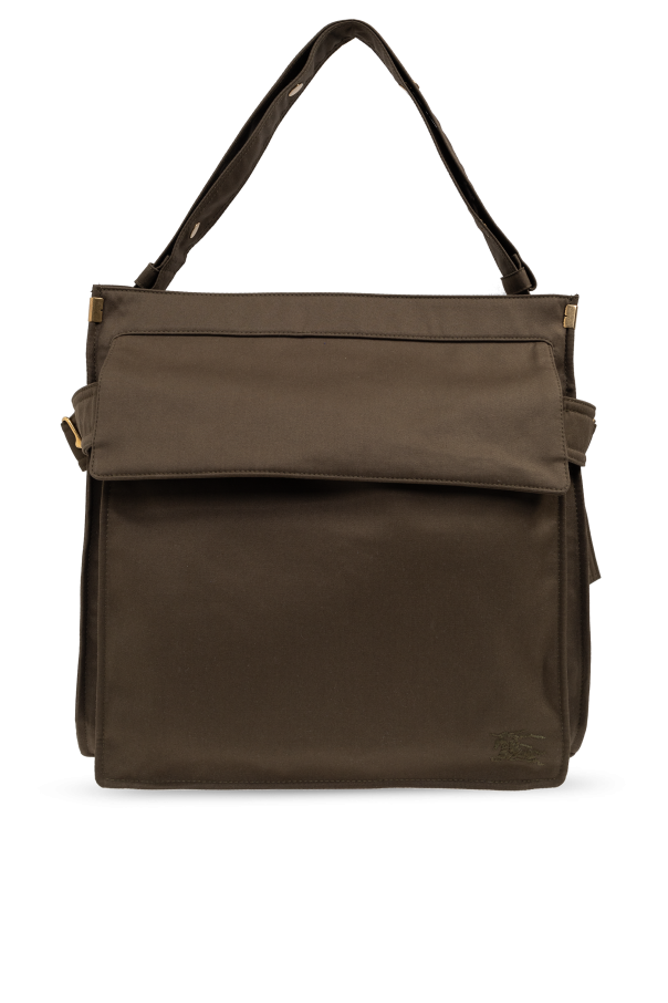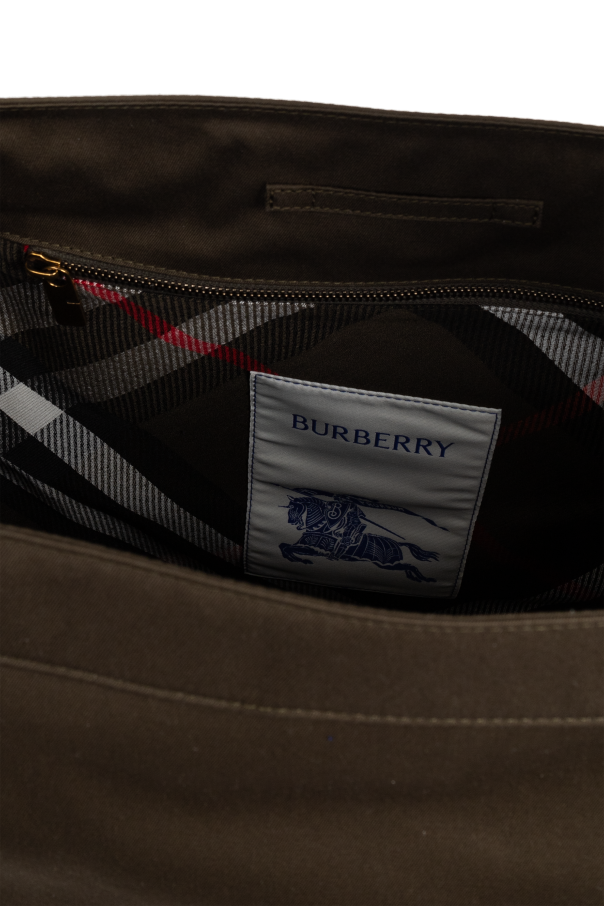 Introducing the Burberry 'Trench' Shopper Bag, an epitome of luxury meeting functionality. This exquisite piece is crafted in a rich, olive green hue that exudes an aura of sophistication and timeless elegance. The bag's canvas structure, highlighted by a subtle sheen, suggests the use of high-quality cotton or a premium cotton blend, ensuring durability and a luxurious feel. The rectangular, vertical orientation of the bag offers ample space, making it a versatile accessory for everyday use or special occasions. Its flap closure, complemented by an internal zipper, secures your belongings with an additional layer of protection. Long, flat handles allow for comfortable shoulder wear, while golden metal details such as rivets and clasps add a touch of glamour, characteristic of high-end accessories. The interior, spacious and practical, is adorned with Burberry's classic check pattern, adding an iconic signature to this exceptional piece. A discreetly placed designer logo on an internal pocket reaffirms the luxury status of the 'Trench' shopper, making it a must-have for those who value elegance and functionality. Why Purchase This Product? Luxurious, high-quality material blend ensuring durability and comfort. Ample interior space with secure zipper compartment for functionality. Elegant olive green hue and golden details for a sophisticated look. Iconic Burberry check pattern interior, marking a statement of luxury.
