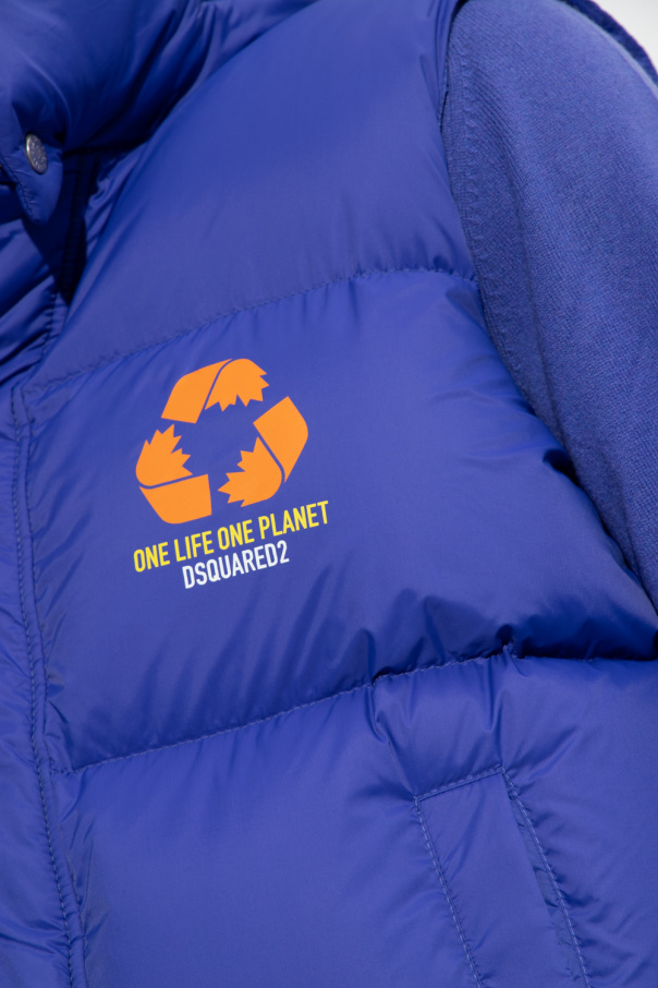 Blue quilted vest from Dsquared2, the ‘One Life One Planet’ collection. Embellished with an orange, yellow and white logo print, this style fastens with a zipper and snaps and features a concealed hood and two snap-fastened pockets.