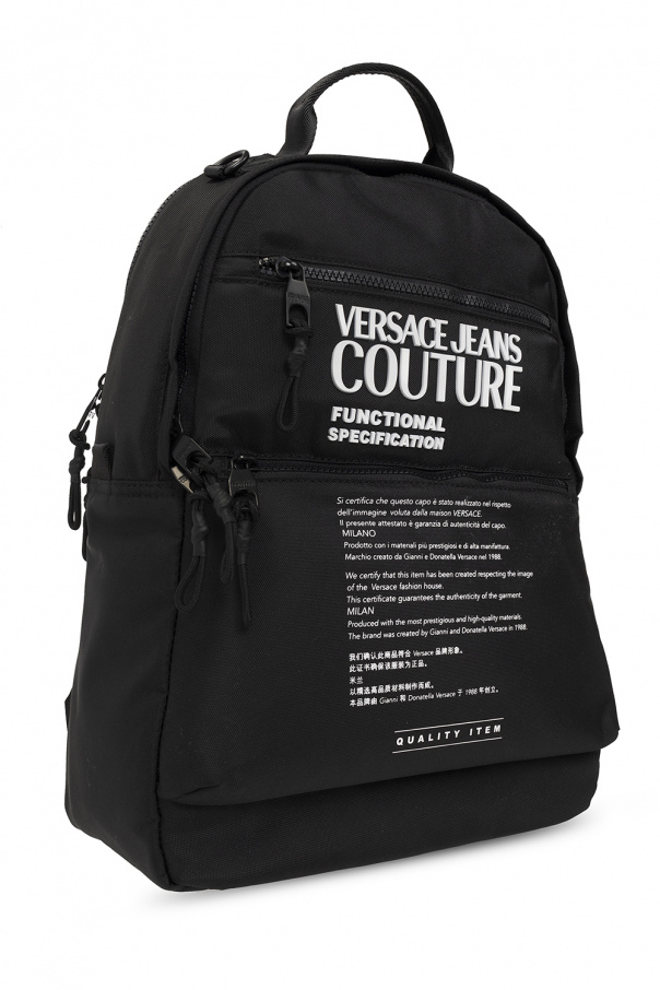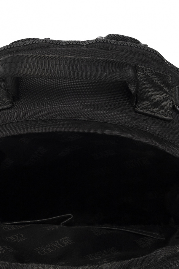 Black backpack from Versace Jeans Couture. With two separate compartments with two-way zip detailing, this design features adjustable shoulder straps, a top half-round handle and two zip pockets accompanied by a white graphic print and a white rubber logo detail on the front.