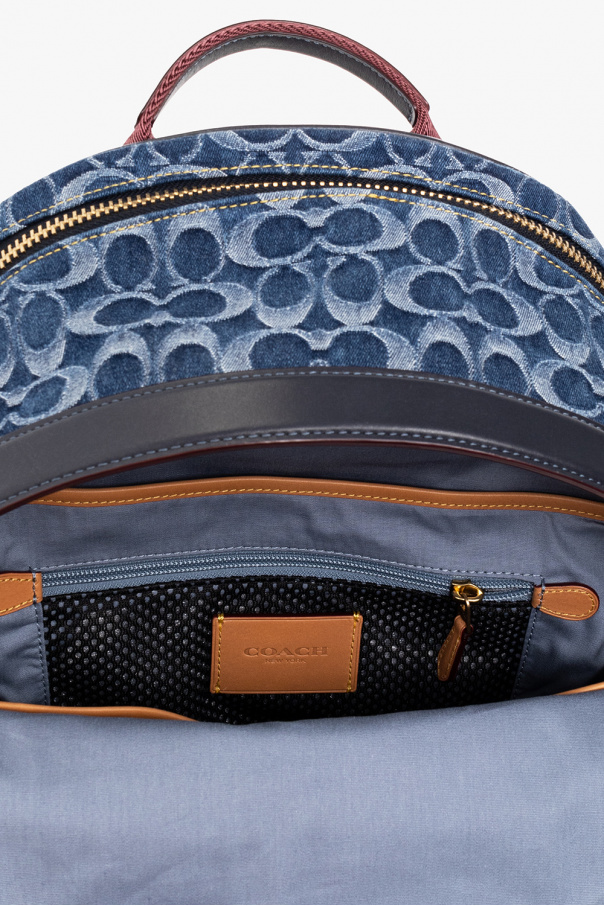 Navy blue and blue ‘Charter’ backpack from Coach. Crafted from monogrammed denim and trimmed with calf leather, this design features two separate zip compartments, yellow stitching details, a front zip pocket, a half-round handle, adjustable straps, gold-tone metal hardware and slip pockets inside.