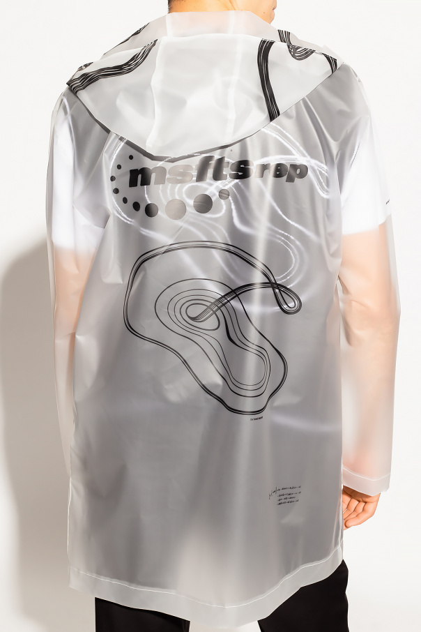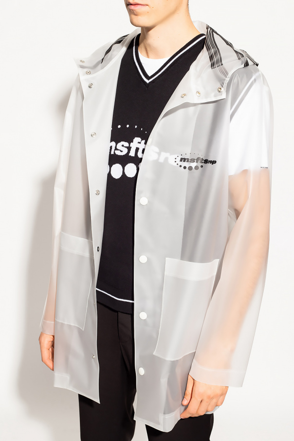 White transparent rain coat from MSFTSrep. Fastened with buttons, this long sleeve design is decorated with a black logo pattern and complete with two slip pockets.