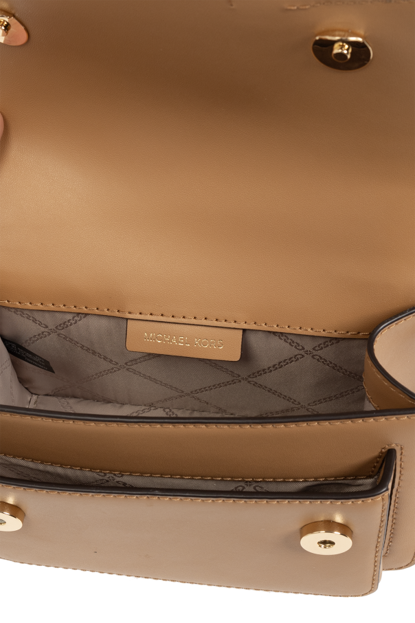 Brown ‘Heather’ shoulder bag from Michael Michael Kors. Made of leather, this design fastens with magnetic snaps and is decorated with a logo detail. It is complete with a back pocket with a magnetic snap, chain interlaced with leather, gold-tone metal hardware and one internal compartment with one slip pocket and three card slots.
