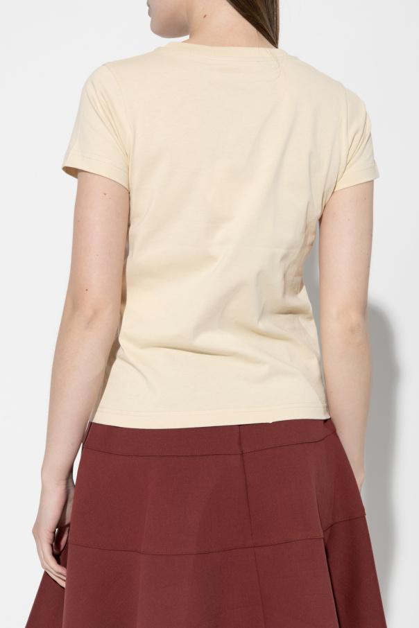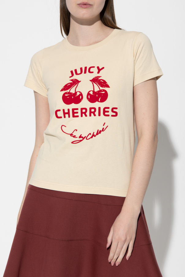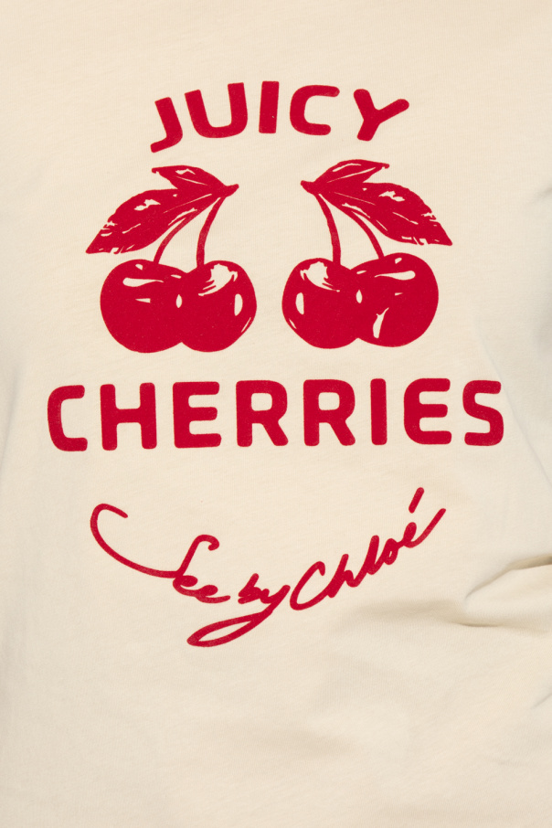 Light beige T-shirt from See By Chloé. Crafted from cotton, this short sleeve design features a red cherry and logo print with a velvet finish and ribbed crew neck.