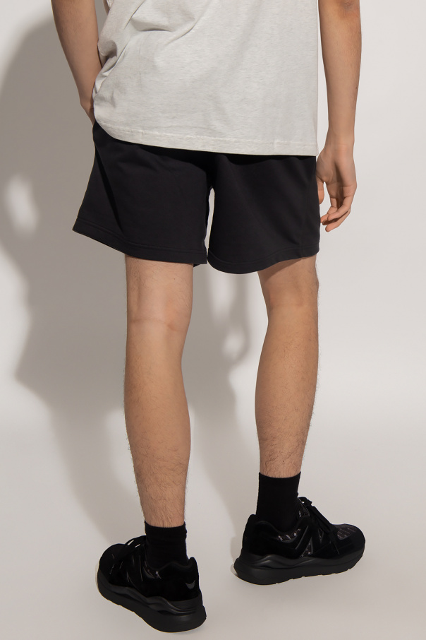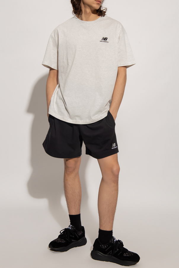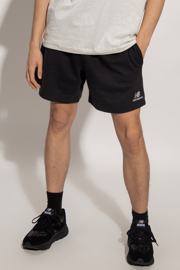 Black sweat shorts from New Balance. Embroidered with the brand's logo in grey and white, this pair features a drawstring waist and three slip pockets. This model was created as part of the Better Cotton Initiative that promotes the improvement of cotton growing standards and is distinguished by the 'Green Leaf' symbol, which indicates that products were made of at least 50% environmentally friendly materials - recycled or organic.