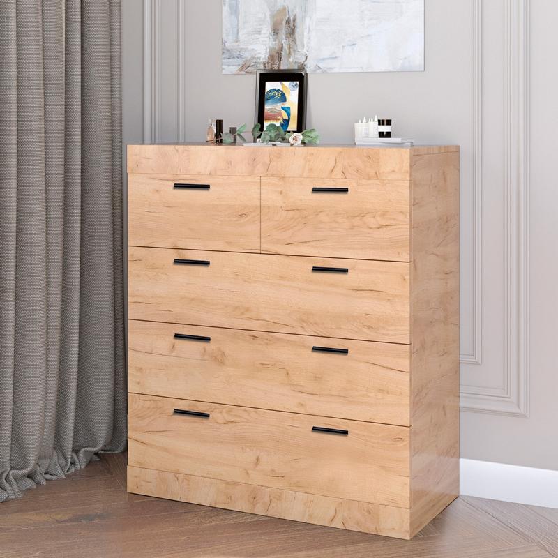 деталей. Емкость комода включает три широких выдвижных ящика и два маленьких,