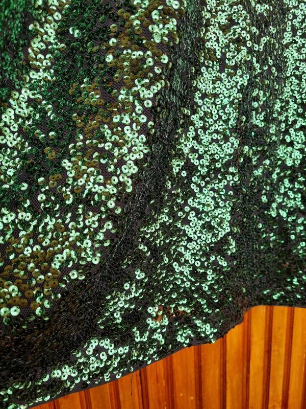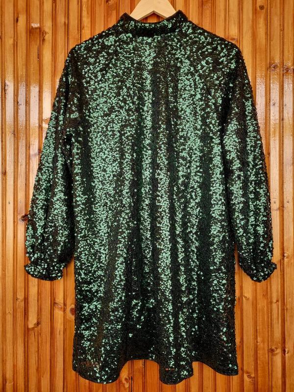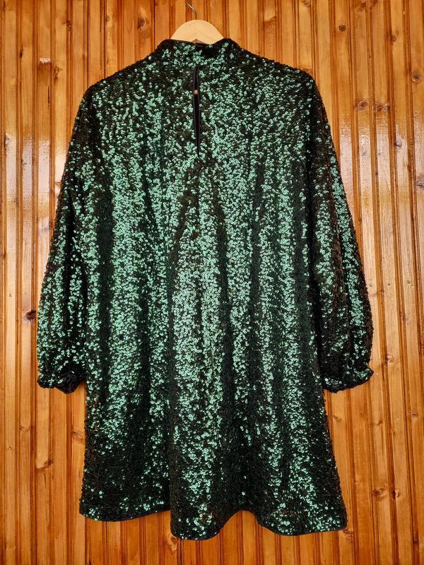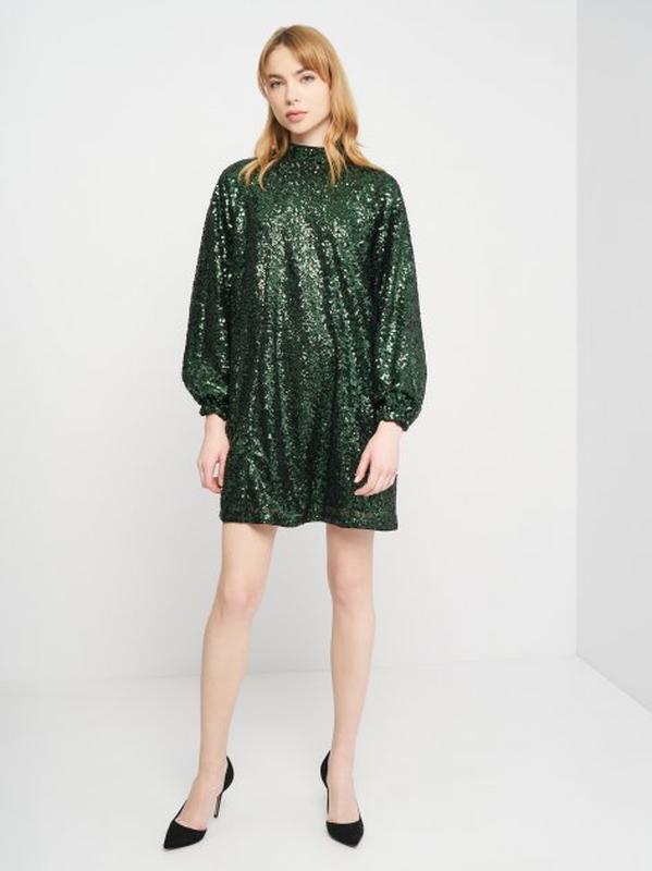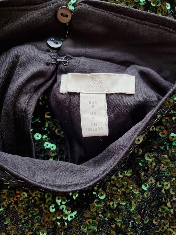 Вечернее платье мини H&M в пайетки. В наличии размер на бирке S 165/88А. Крой трапецией. На подкладке. Низкий воротник стойка и разрез сзади с застежкой на пуговицы и крючок у горловины. Длинные широкие рукава с резинкой снизу.