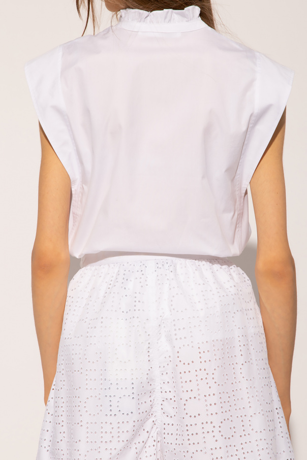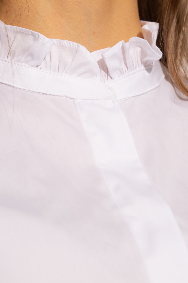 White ‘Mejsi’ shirt from Samsoe Samsoe. Crafted from organic cotton, this style features a standing collar trimmed with a ruffle, short sleeves and button fastenings with a concealed placket.