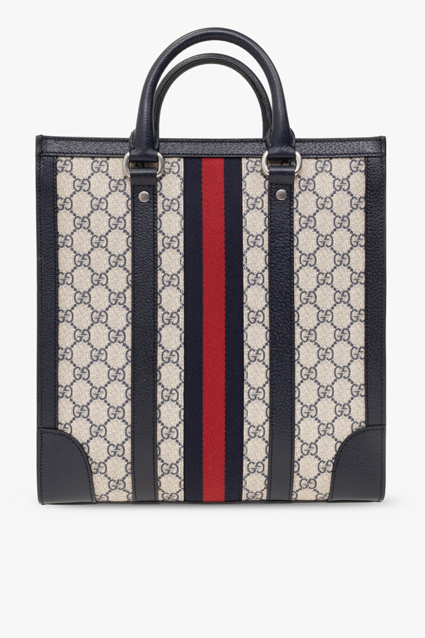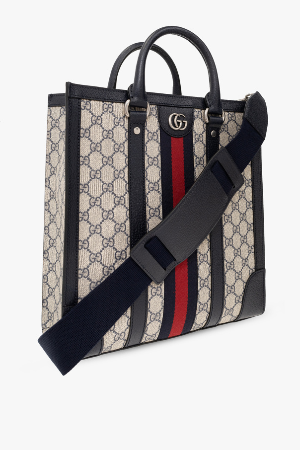 Cream and navy blue ‘Ophidia Medium’ shopper bag from Gucci. Crafted from ‘GG Supreme’ canvas and trimmed with leather, this design features a lobster clasp fastening, a logo plaque, navy blue-red-navy blue ‘Web’ stripe detailing, two half-round handles, a detachable and adjustable strap, silver-tone metal elements and one internal compartment with one zip pocket and one slip pocket.