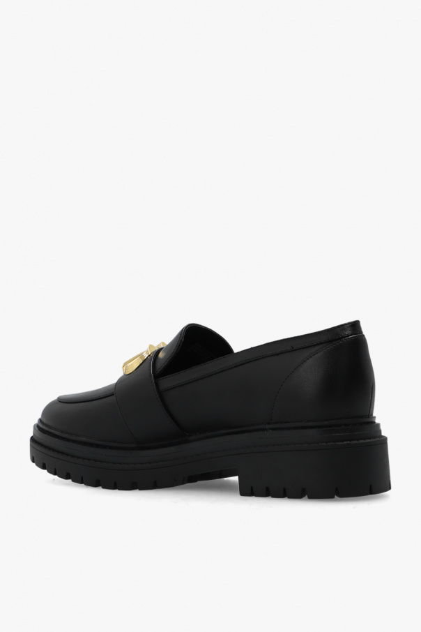Black ‘Parker’ loafers from Michael Michael Kors. Crafted from leather, this model sits on a black rubber sole and showcases gold-tone logo hardware on the front.