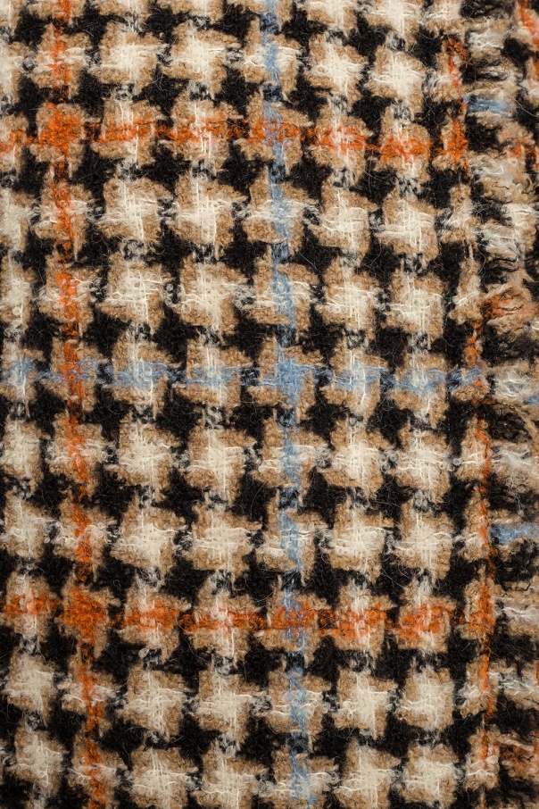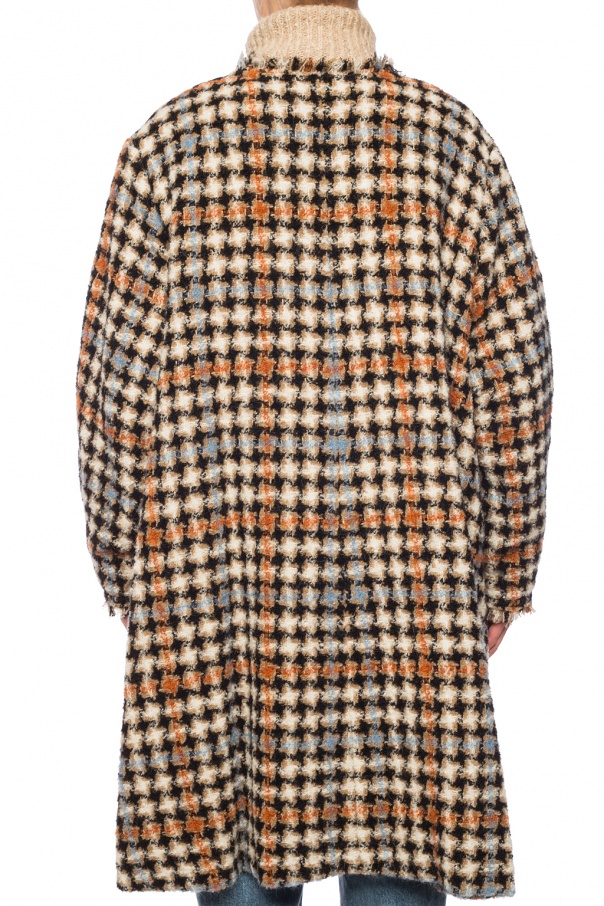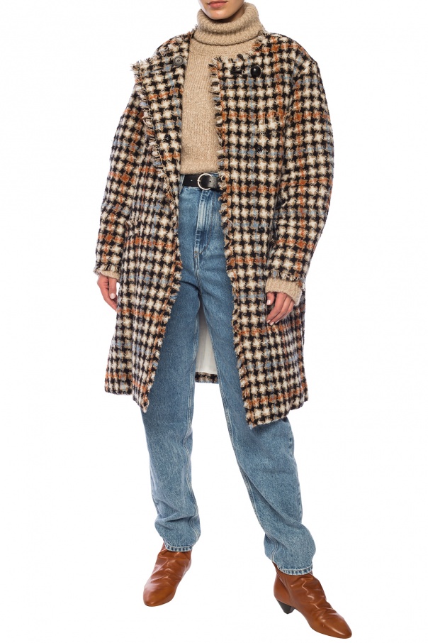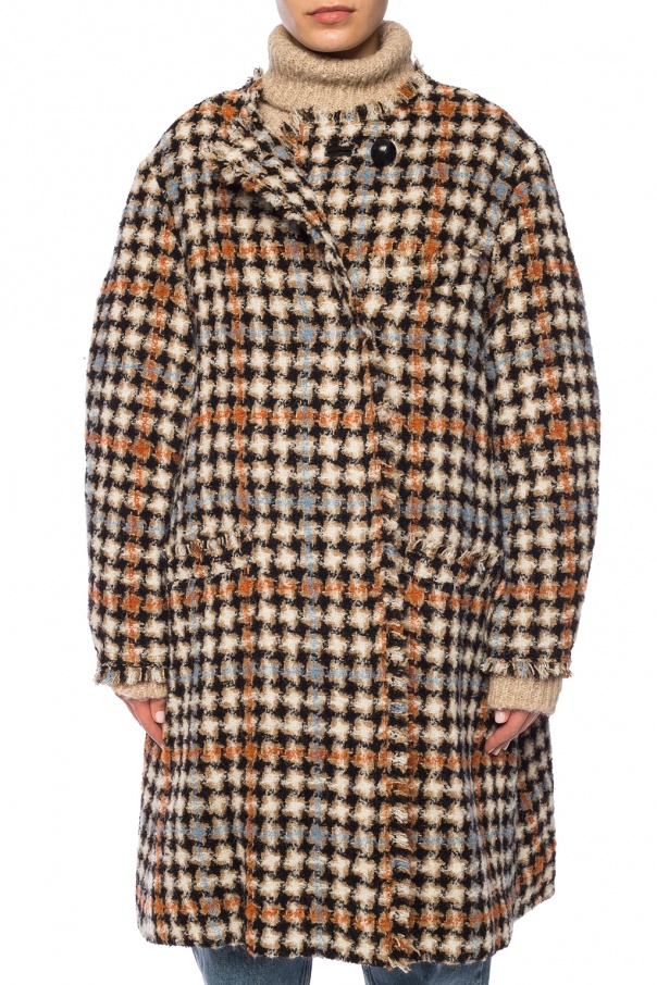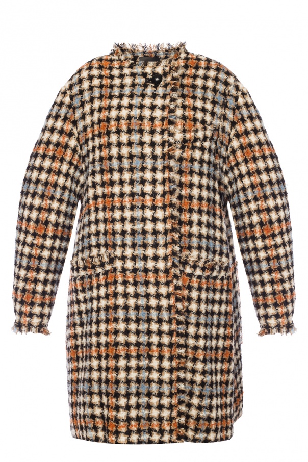 White, brown and black coat with a raw trim from Isabel Marant. Fastened with buttons. Decorated with an embroidered check pattern in orange and blue. 3 slip pockets on the front.