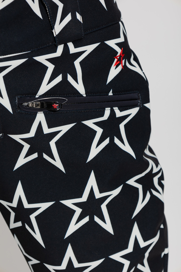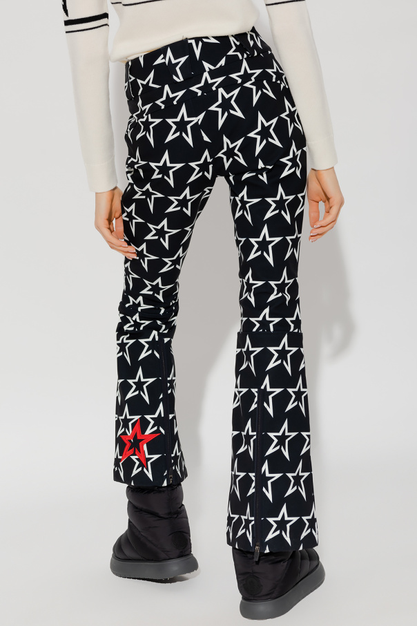 Black and white ‘Aurora’ ski trousers from Perfect Moment. Made of breathable Toray Dermizax™ stretch-shell, which protects against moisture and cold temperatures, this fitted design is complete with a zip, hook and snap button fastenings, logo with the brand’s signature star, incorporated knee pads and two-layered, flared legs – zipped outer layer and elasticated fleece lining with snap fastenings.