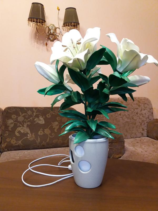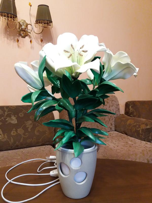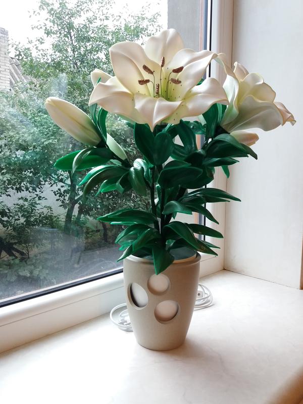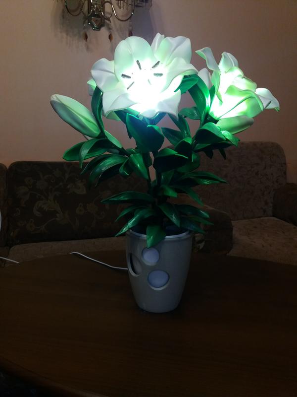 Букет з 3 лілій(світяться всі три) і 6 бутонів в кашпо з кераміки.Матеріал-ізолон.