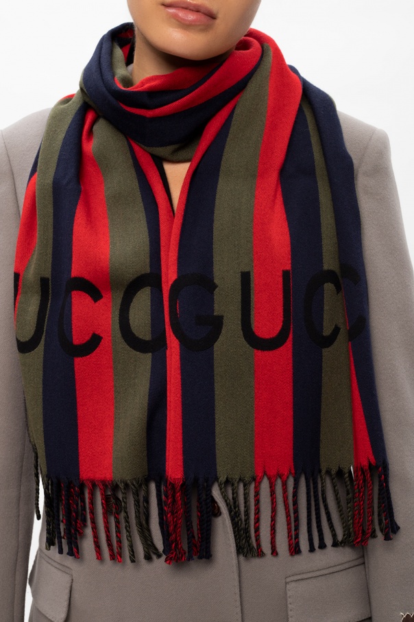 Multicoloured scarf from Gucci. Crafted from wool, this accessory is enriched with fringes, a stripe pattern and a logo embroidery.