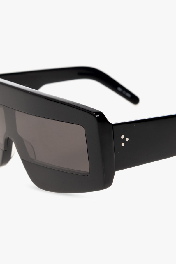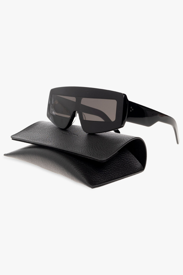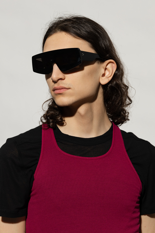 Black sunglasses from Rick Owens. This pair features rectangular, futuristic frames, wide temples and grey lenses with 100% UV protection. Comes with a case.