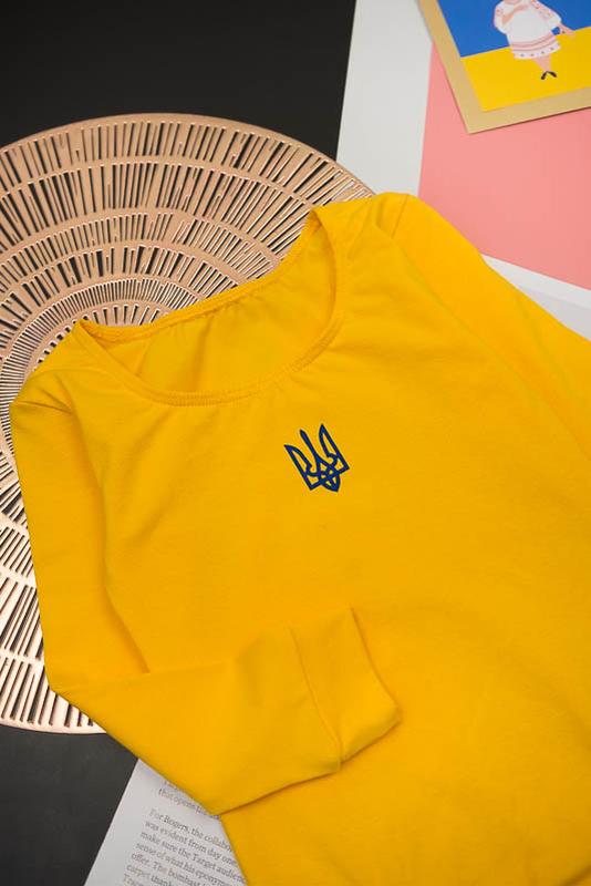 Спортивний тренувальний купальник з довгим рукавом призначений для гімнастики та інших спортивних занять. Модель виготовлена в патріотичних тонах та прикрашена малюнком «Тризуба». Виготовлений зі стрейч-куліру - еластичного і приємного до тіла полотна, до складу якого входить 95% бавовни та 5% лайкри, що допомагає полотну не витягуватися і зберігати форму після численних прань.