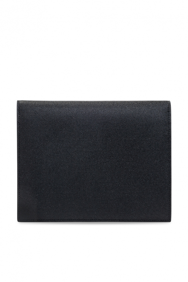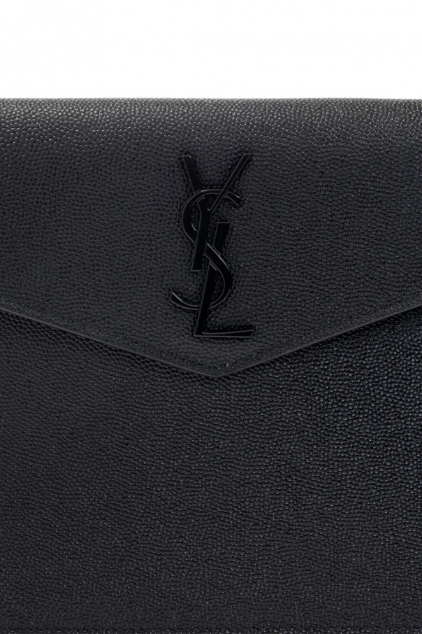 Black ‘Uptown’ clutch from Saint Laurent. Crafted from leather, this design features a magnetic fastener, a metal logo plaque on the front and one internal compartment.