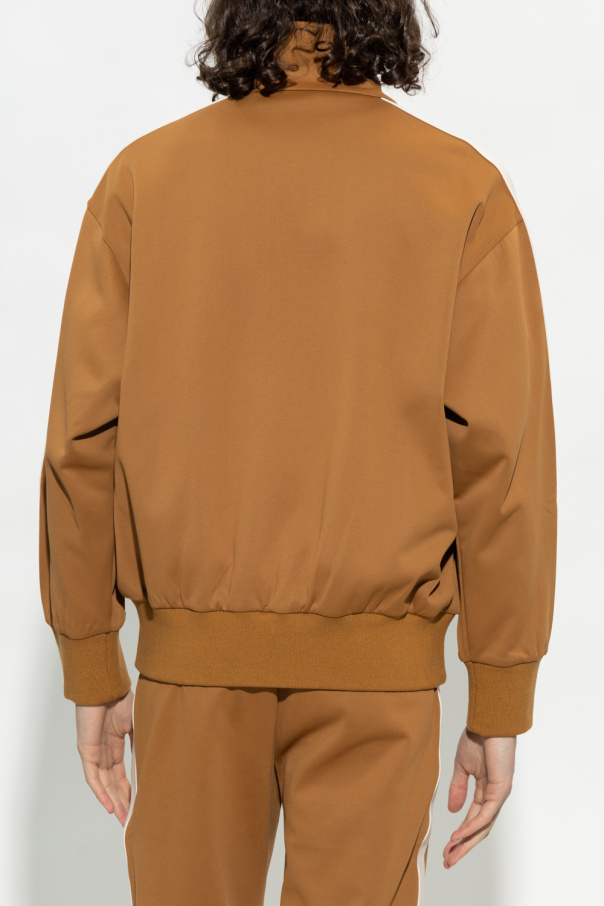 Brown sweatshirt with a standing collar from Bally. Crafted from a cotton blend, this style fastens with a zip and features logo embroidery on the front, two slip pockets, cream leather straps on the long sleeves and ribbing on the bottom hem and cuffs.