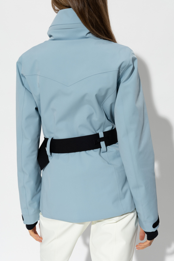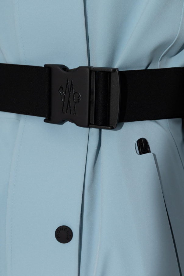 Light blue and black ‘Hainet’ jacket from Moncler Grenoble, the ‘Moncler Grenoble High Performance’ collection. Emblazoned with a rubber logo patch, this style secures with a two-way zipper and snaps and features a waist-cinching black belt with a buckle, multiple zip pockets, a retractable hood and long sleeves with elasticated cuffs and thumbholes. Equipped with RECCO® technology.