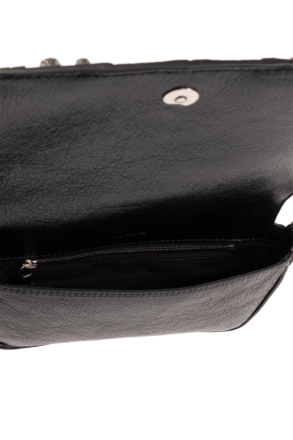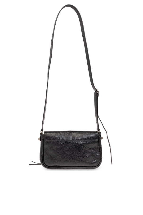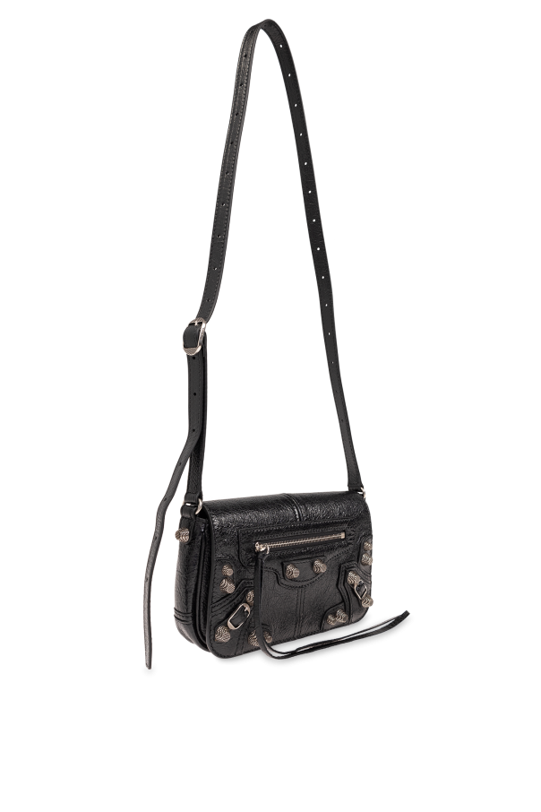 Introducing the epitome of modern luxury and refined style: the 'Le Cagole Mini' shoulder bag, exclusively designed by the illustrious Balenciaga. This exquisite piece, intended for the discerning gentleman, melds timeless elegance with contemporary flair. Crafted from the finest 100% lamb leather, its textured surface exudes an air of sophistication, while its rectangular shape with rounded corners offers a sleek, modern silhouette. The bag's black hue serves as a versatile backdrop to its striking metal accents, including riveted details and buckles that capture the eye. A front pocket with zipper closure and decorative tassels add a touch of whimsy and practicality. The long, adjustable shoulder strap ensures a comfortable fit, whether worn across the body or draped over the shoulder, further enhanced by an additional length adjustment feature. Security is paramount with a top zipper closure, ensuring your belongings remain safe within the sumptuous interior. This piece is not just a bag, but a statement of unparalleled craftsmanship and an ode to the Balenciaga legacy. Why Purchase This Product? Exclusive Design: Crafted by the renowned Balenciaga, ensuring a unique and fashionable accessory. Premium Materials: Made with 100% lamb leather and metal accents for durability and style. Versatility: Elegant black hue and adjustable strap for varied styling options. Functional Details: Practical features like a front pocket and secure top zipper enhance utility and design.