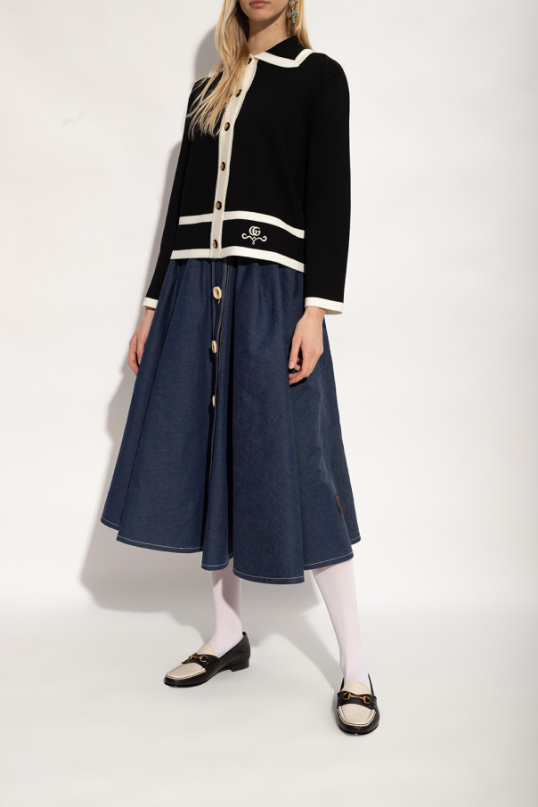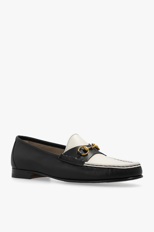 Black and cream ‘1953 Horsebit’ loafers from Gucci. Made of leather. Resting on a brown rubber sole, this pair features the brand’s signature horsebit in antique gold-tone.