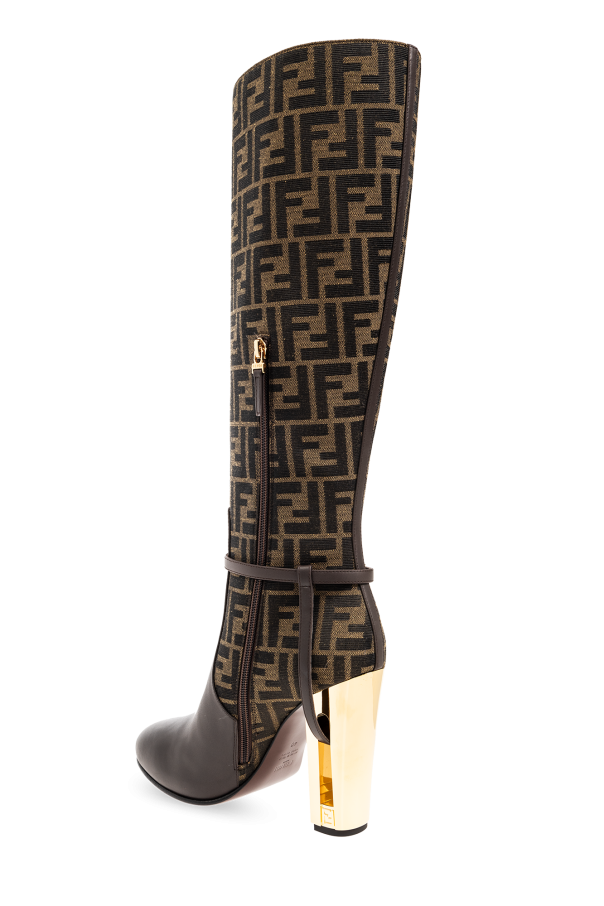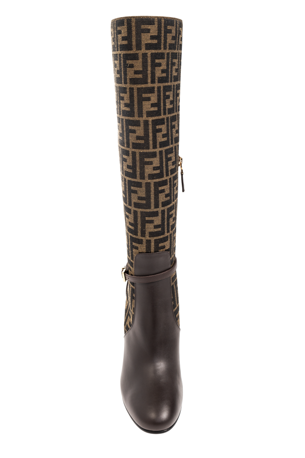 Brown and beige boots from Fendi. Made of leather and fabric, this model sits on a leather sole and features a monogram pattern, a side zip and a distinctive, gold-tone heel.