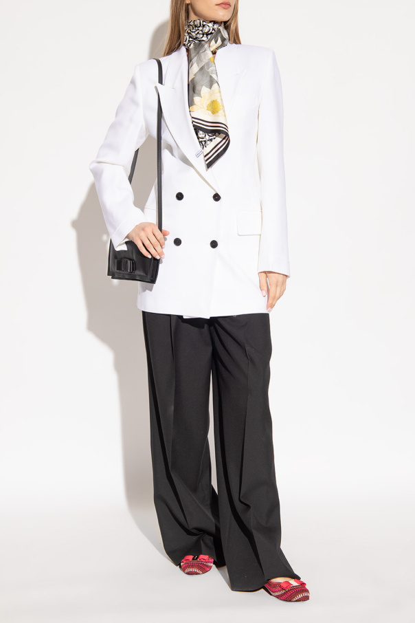 Maroon and pink ‘Varina’ ballet flats from FERRAGAMO. Crafted with a macramé finish, this model features a bow with a logo-engraved plaque on the front and a beige and black leather sole at the base.