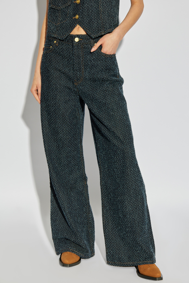 Embrace the epitome of timeless elegance with the Bootcut Jeans from GANNI's exclusive collection. These jeans, crafted from pure organic cotton, boast a rich navy hue that exudes sophistication. The bootcut silhouette subtly flares at the hem, offering a classic yet contemporary look that transcends seasons. Adorned with distinctive contrast stitching and featuring a signature logo patch on the back pocket, these jeans capture the essence of refined style. A total of five slip pockets add both practicality and a quintessential element of classic denim design. Perfectly paired with a coordinating vest, these jeans elevate any ensemble with their chic and fashionable appeal. Why Choose This Product? Crafted from 100% organic cotton for superior comfort and sustainability. Bootcut design provides a flattering fit with a touch of flair. Exquisite contrast stitching adds a unique, artisanal touch. Signature GANNI logo patch for an authentic designer finish. Five slip pockets for timeless, functional style.