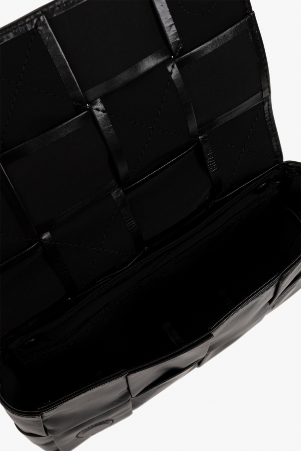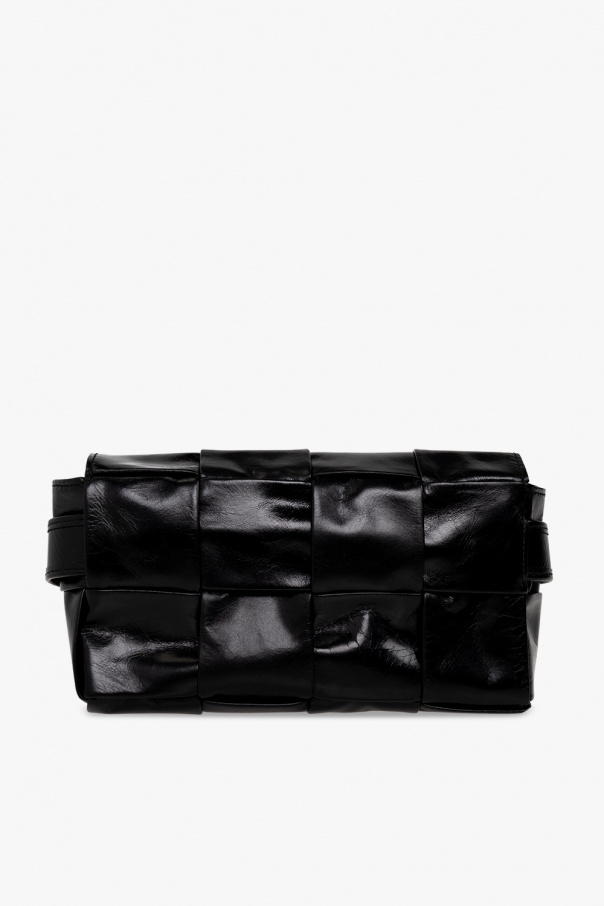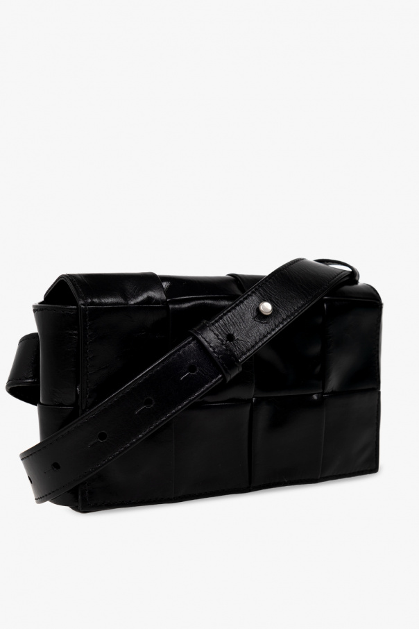 Black ‘Cassette Mini’ belt bag from Bottega Veneta. Made from calf leather with the brand's iconic Intreccio weave, this design secures with magnetic snaps and features an adjustable strap and one internal compartment with a slip pocket.