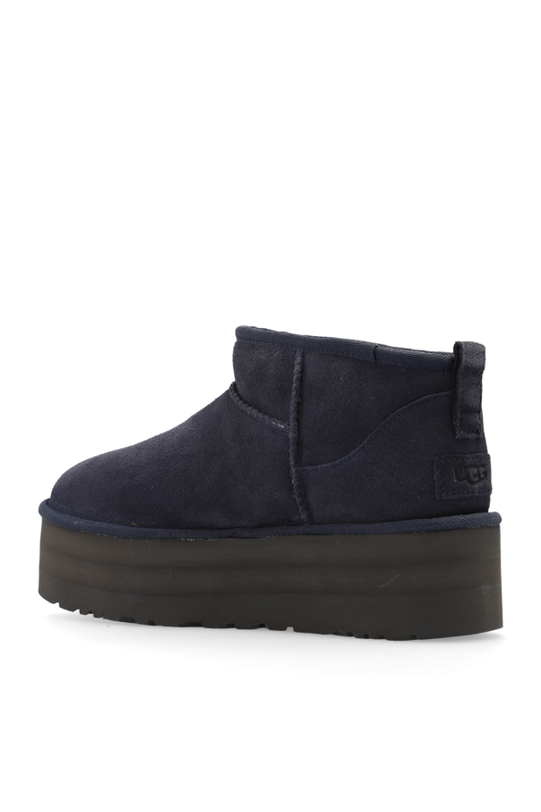 Navy blue ‘Classic Ultra Mini Platform’ snow boots from UGG. Made from Twinface sheep leather and lined with UGGplush™, this model sits on a dark grey Treadlite by UGG™ EVA foam sole and features a logo patch at the back and textile binding made from 100% recycled polyester fiber.