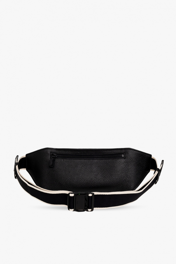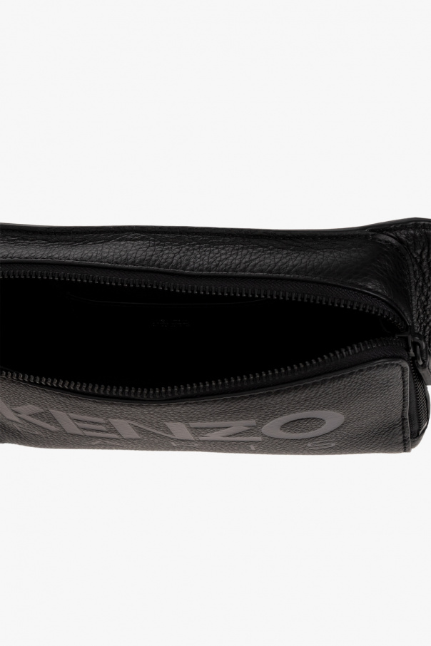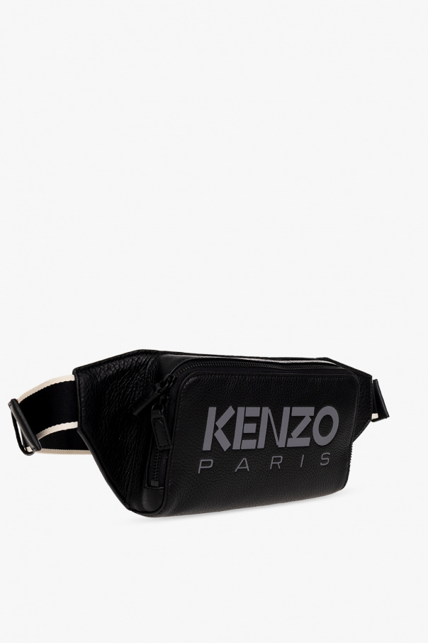 Black belt bag from Kenzo. Crafted from cow leather, this model fastens with a zip and is decorated with a grey logo pattern. It is complete with an adjustable shoulder strap, black metal hardware and one internal compartment with one slip pocket.