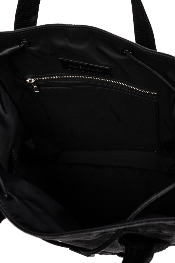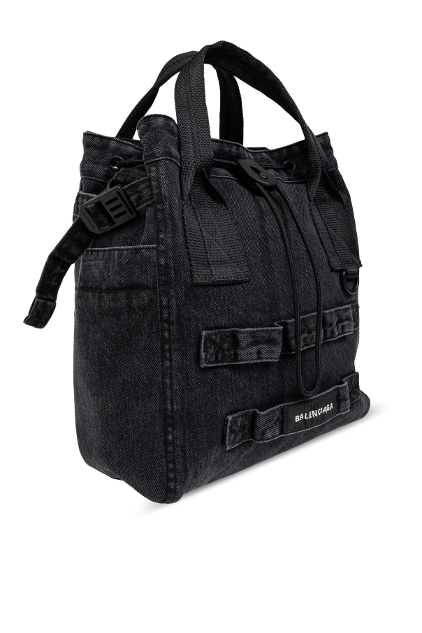 Introducing the "Army Small" Shopper Bag by the esteemed fashion house Balenciaga. This exquisite piece epitomizes the perfect blend of functionality and minimalist elegance. Crafted from durable, dark denim-like fabric, this bag boasts a spacious rectangular shape with subtly rounded edges, embodying the quintessential shopper silhouette. Its sleek black hue enhances its sophisticated appeal, making it a versatile accessory for any wardrobe. The bag features two sturdy, short handles and includes a longer, adjustable shoulder strap for added versatility. Secured with a snap closure and additional strap buckles, your belongings are kept safe and stylishly contained. Inside, a zippered pocket offers secure storage for smaller essentials. Adorned with the iconic BALENCIAGA logo on a discreet front tag, this bag also includes functional front straps, perfect for attaching extra items. The interior is lined with dark fabric, adding to its refined aesthetic. Why Choose This Product? Elegant Design: Combines modern minimalism with practical features. High-Quality Materials: Made from durable, denim-like fabric. Versatile Use: Comes with both short handles and a long, adjustable strap. Secure Storage: Features a snap closure, additional straps, and an interior zippered pocket. Exclusive Branding: Showcases the prestigious BALENCIAGA logo.