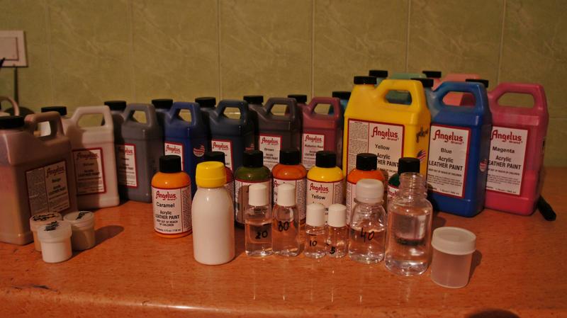- кожу очистить и обработать средством angelus Leather preparer and deglazer (очищает кожу от старой краски и финиша и подготавливает к покраске), или другим средством на основе ацетона.